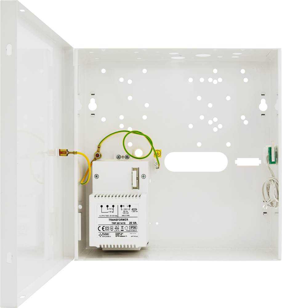 Wymiary zewnętrzne obudowy: 250 × 250 × 88 mm (±2 mm)Wymiary czołówki: 255 × 255 mm (±2 mm)Miejsce na akumulator: 1 × 7 Ah / 12 V (SLA)Waga netto/brutto: 1,95 / 2,10 kgTransformator:TRP 20VA / 14V / 18V– obudowa PC/ABS, klasa UL94-V0– stopień ochrony: IP30Zasilanie: 230 V AC (–15% / +10%), 50 Hz, max. 120 mAWyjście zasilania:– U1 = 14 V AC / I1 = 1,4 A (max)– U2 = 18 V AC / I2 = 1,0 A (max)– tolerancja napięcia: –5% / +15%Warunki pracy:– temperatura: –10°C do +40°C– wilgotność względna: 20–90%, bez kondensacjiWykonanie:– blacha stalowa DC01, grubość 0,7 mm– kolor: RAL 9003 (biały), zabezpieczenie antykorozyjne– montaż wewnętrznyZabezpieczenia antysabotażowe:– 1 × mikrowyłącznik (otwarcie obudowy), NC, 0,5 A / 50 V DC– opcjonalnie: 1 × mikrowyłącznik (oderwanie od ściany, wymaga PKAZ066)Zamykanie: skręcane (4 × wkręt walcowy)Opcje dodatkowe: możliwość montażu zamka MR008 lub MR027Dystans od ściany: 8 mm