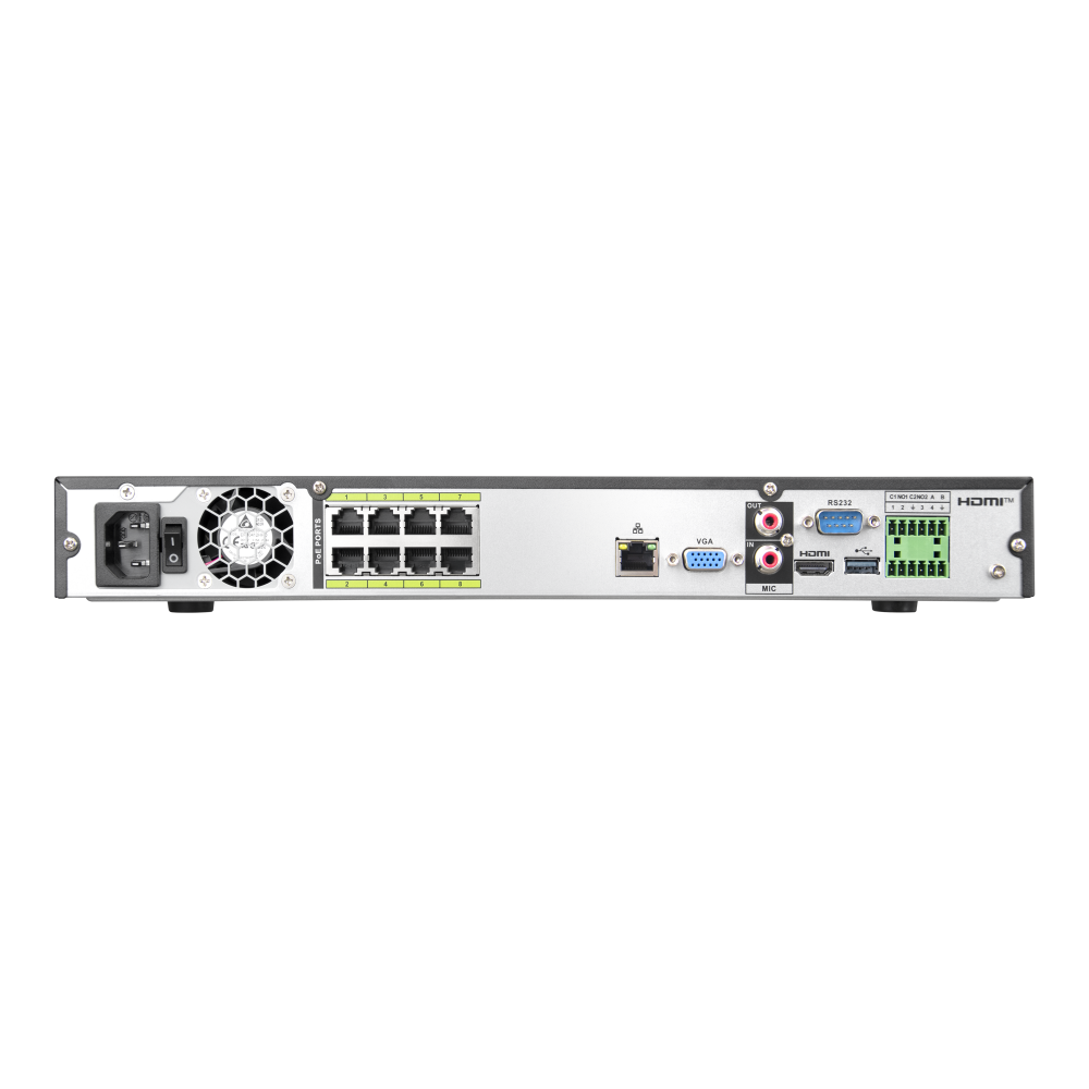 8 kanałowy rejestrator IP Wbudowany switch PoE 130W Technologia AcuPick Obsługa 2 dysków twardych Obsługa kamer IP 32Mpx Alarm 4/2, audio 1/1 Wyjście HDMI8K/VGA Wbudowane funkcje inteligentne