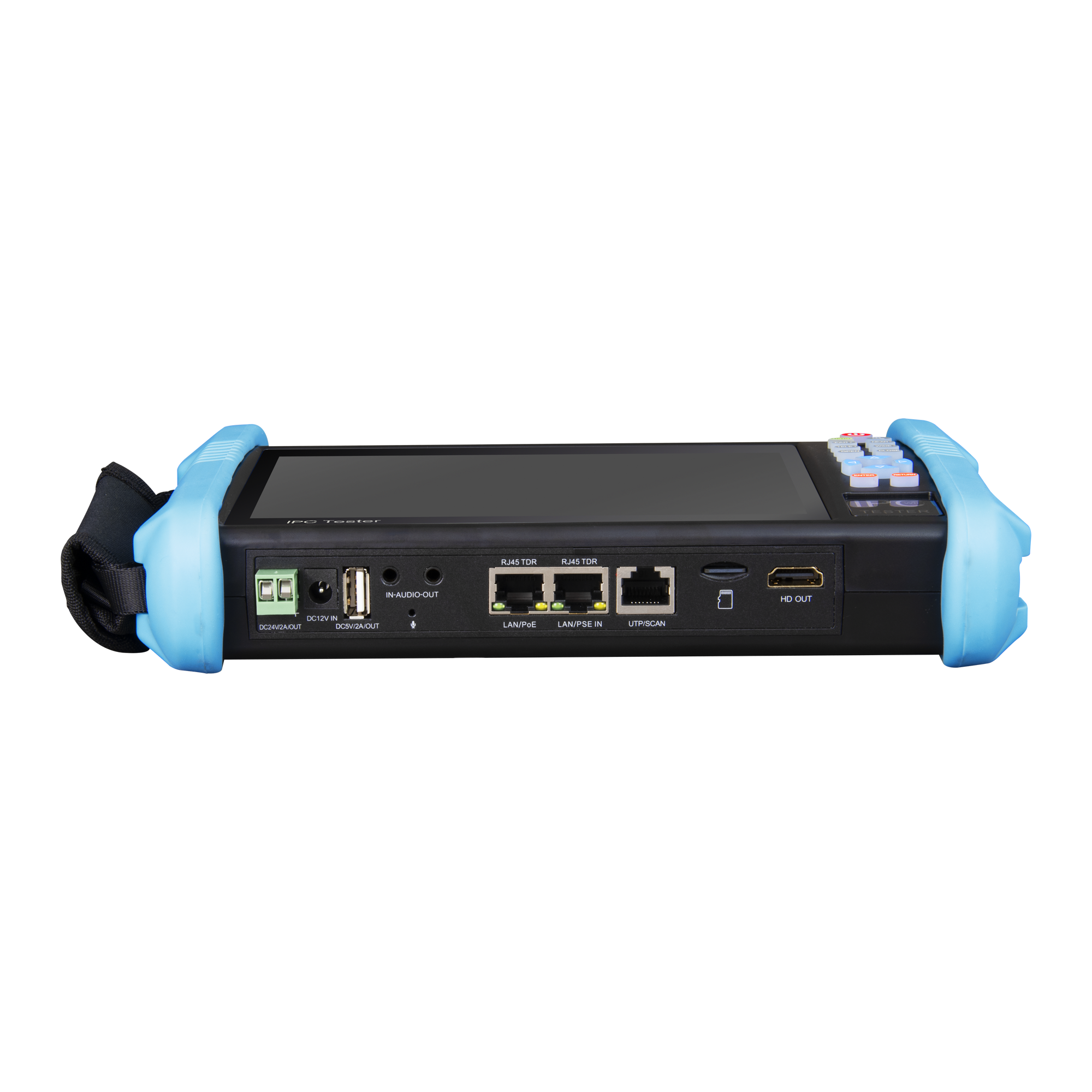 Tester CCTV All-in-one, bateria litowo-polimerowa 7.6V 7800mAh, 7 calowy ekran dotykowy 1280×800, karta microSD 8GB, zasilanie DC12V, HDMI IN/OUT 1080p, DC24V/2A OUT, DC12V/3A OUT, USB DC5V/2A OUT, audio IN/OUT, CVBS IN/OUT, RJ45 TDR, PoE, UTP/SCAN, obsługa ANALOG do 8Mpx, mikrofon, latarka, Wi-Fi 2.4G, zainstalowane aplikacje do obsługi CCTV.