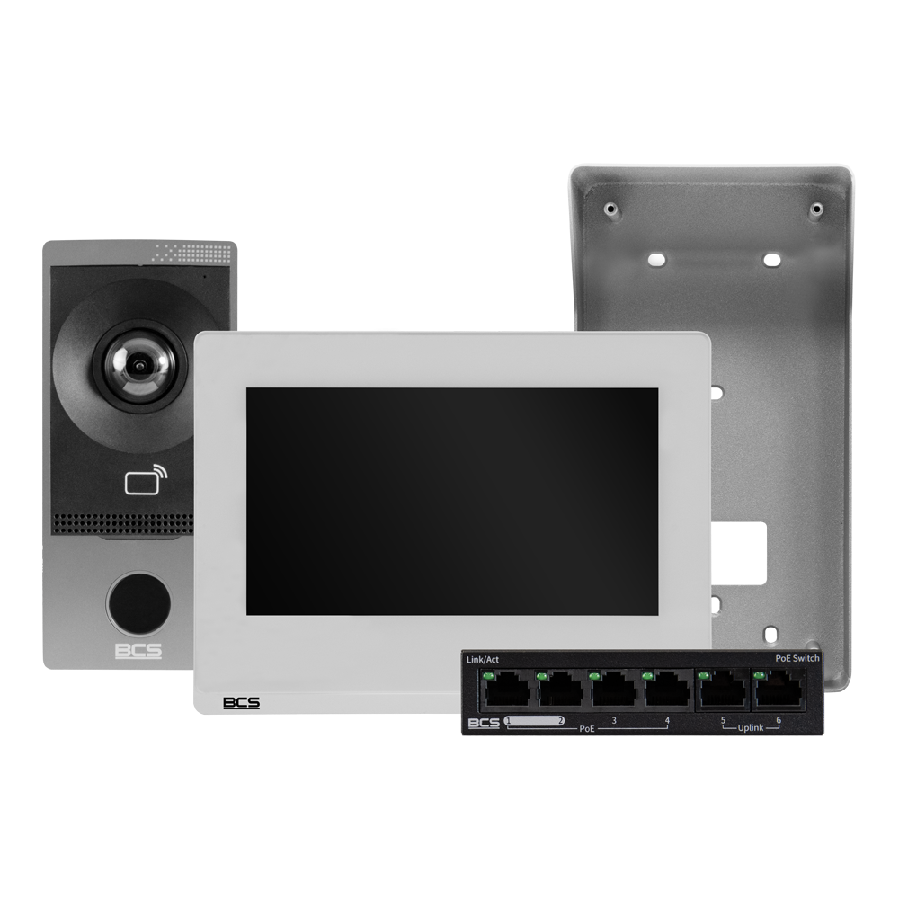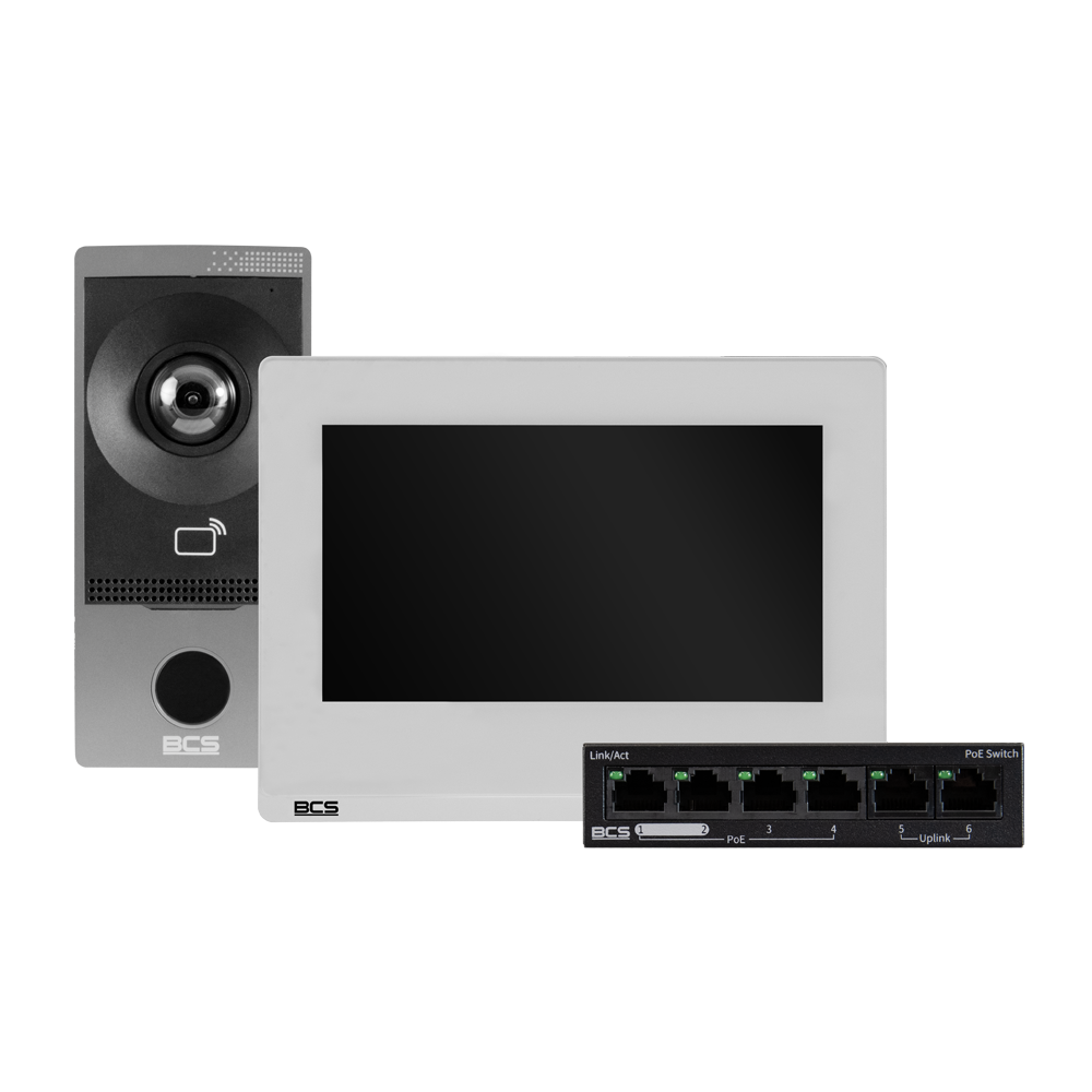 | Krótki opis | Zestaw wideodomofonowy: Panel BCS-P-PAN1101G Biały Monitor BCS-P-MON7100W Switch BCS-P-SP0402 Karta pamięci microSD 32GB |