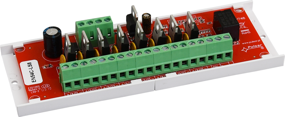 Moduł sekwencyjny EN54C-LS8 przeznaczone do siłowników ze sprężyną powrotnąDedykowany do współpracy z zasilaczami z serii EN54C8x Wyjścia Sygnalizacja optyczna 8x LEDBezpieczniki polimerowe napięcie zasilania 20 ÷ 30 V DCprzeznaczone do siłowników ze sprężyną powrotną8 wyjść zasilania zabezpieczonych niezależnie bezpiecznikami polimerowymi (PTC)parametryczne wejście wyzwalania INPUT (2×4,7 kOm)wyjście techniczne awarii PSUoptyczna sygnalizacja awariidedykowany do zasilaczy przeciwpożarowych serii EN54Cgwarancja – 5 lat od daty produkcji