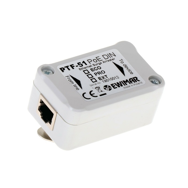 | Krótki opis | PTF-51-EXT/PoE/DIN 1-kanałowe zabezpieczenie przeciwprzepięciowe serii EXT do systemów IP z ochroną PoE na szynę DIN, EWIMAR |